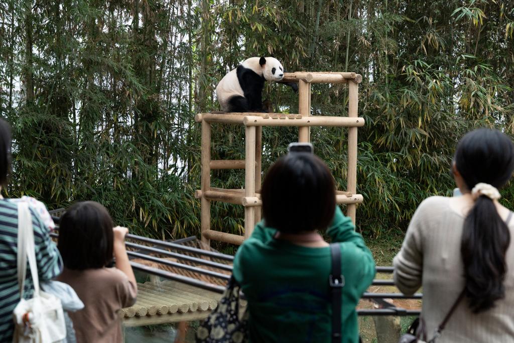 9月30日,游客在韓國(guó)龍仁的愛(ài)寶樂(lè)園觀看大熊貓樂(lè)寶。新華社發(fā)(全休相攝)