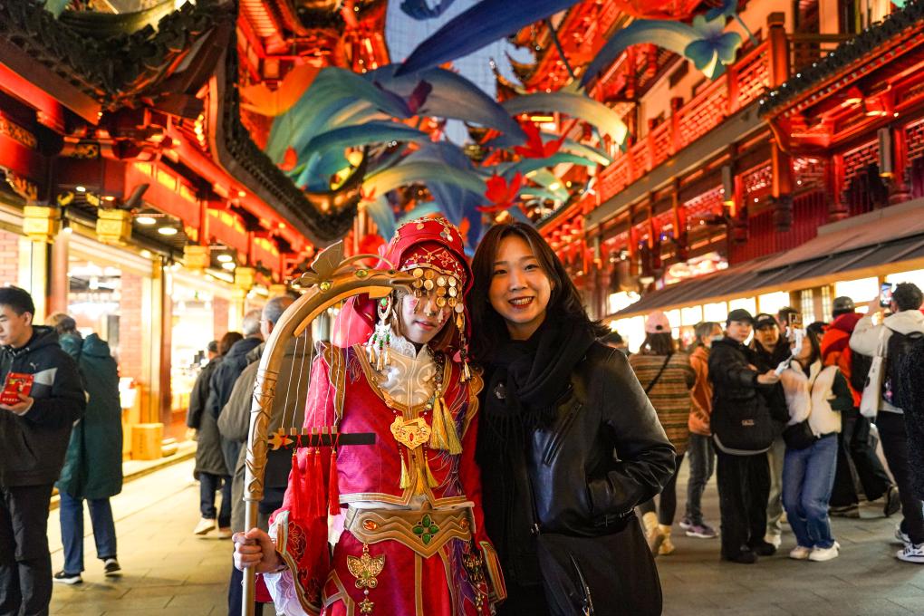 2024年11月30日,來(lái)自韓國(guó)的游客(右)在上海豫園商城與游戲角色裝扮者合影。新華社發(fā)(謝鑫 攝)