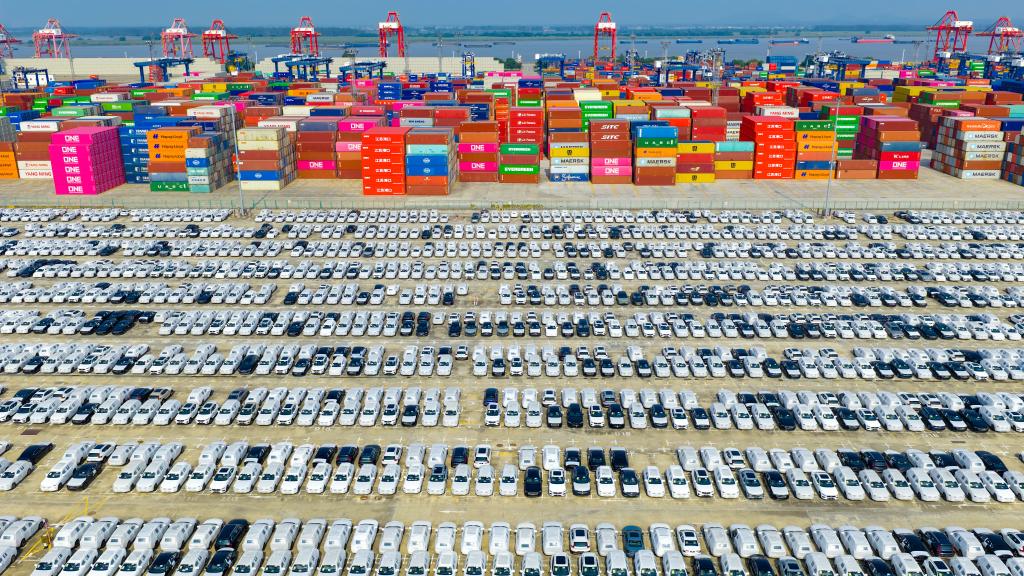 圖為10月4日在江蘇省港口集團(tuán)南京港龍?zhí)陡蹍^(qū)拍攝的準(zhǔn)備裝船出口的汽車(無(wú)人機(jī)照片)。新華社發(fā)(楊素平攝)