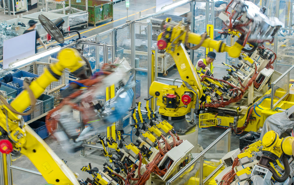 浙江省湖州市長興經濟技術開發(fā)區(qū)的長興地通汽車部件有限公司技術人員操控工業(yè)機器人生產新能源汽車配件(無人機照片,2025年10月9日攝)。新華社發(fā)(譚云俸 攝)