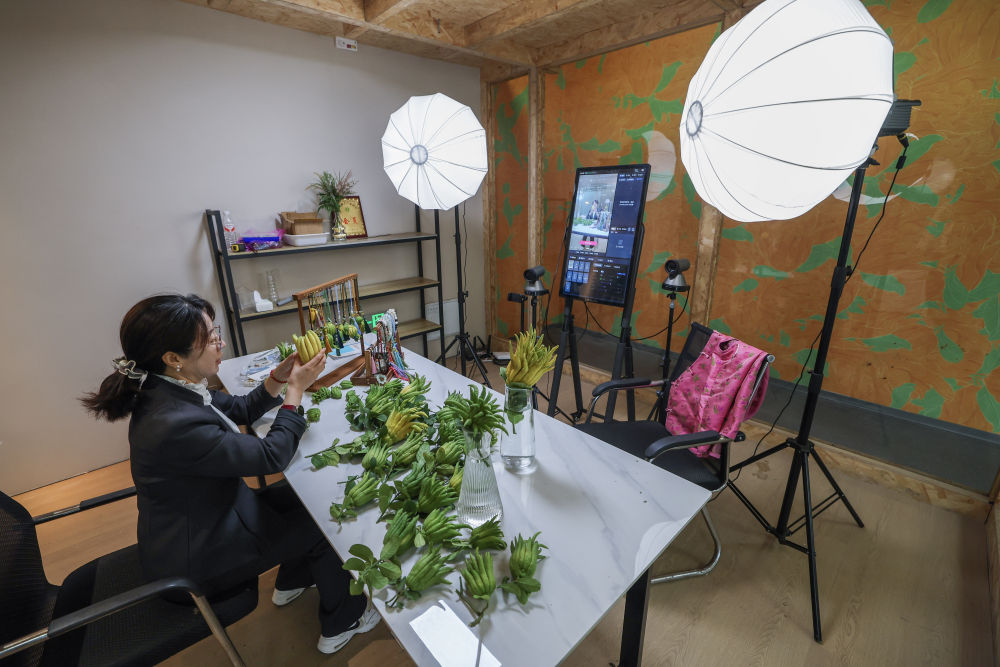 在浙江金華市金東區(qū)赤松鎮(zhèn)北山口村的金華佛手農林服務中心內的直播間,工作人員進行佛手鮮果及衍生產品的直播銷售(2025年10月22日攝)。新華社記者 徐昱 攝