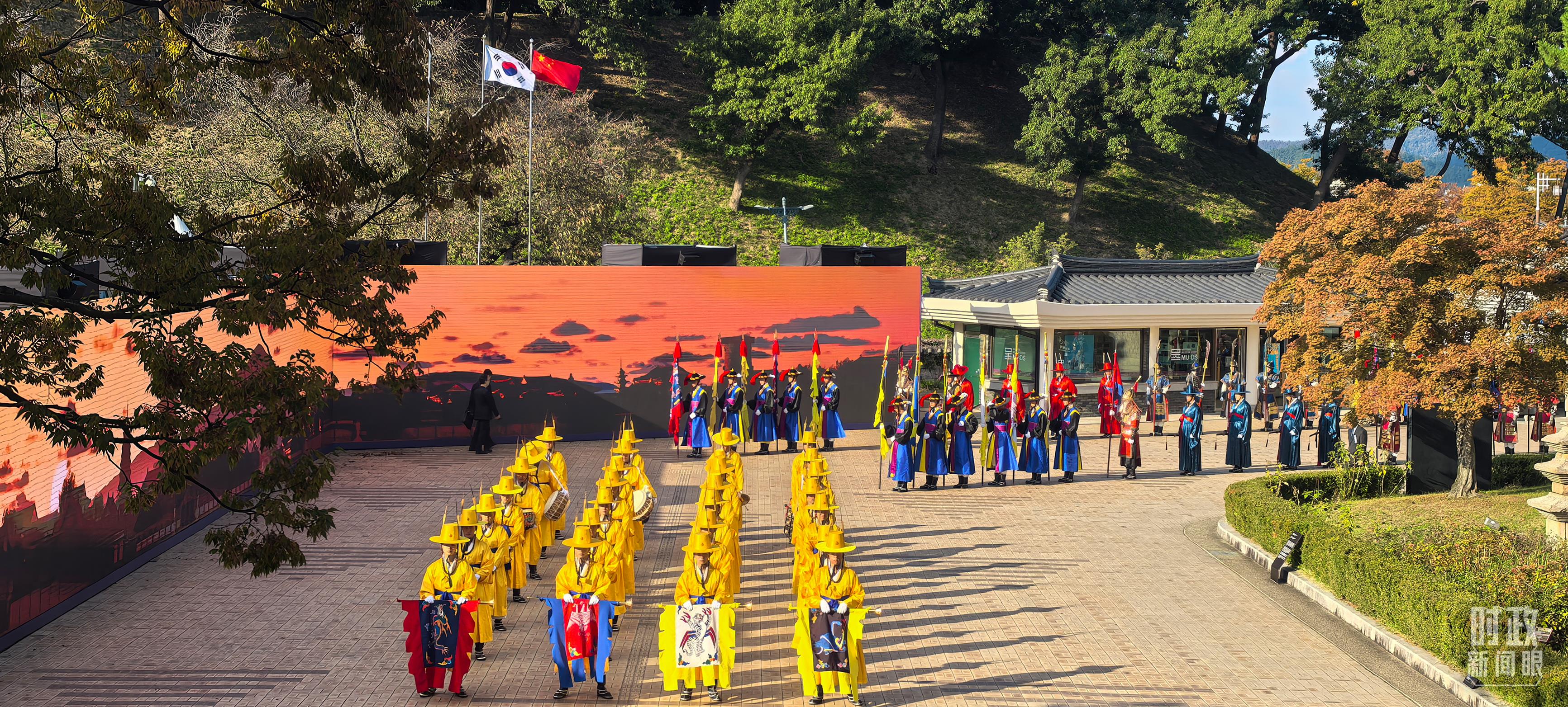 在慶州博物館的千年微笑館,李在明總統(tǒng)為習(xí)主席舉行高規(guī)格歡迎儀式,身著傳統(tǒng)民族服飾的韓國禮儀隊,隆重歡迎習(xí)主席到來。