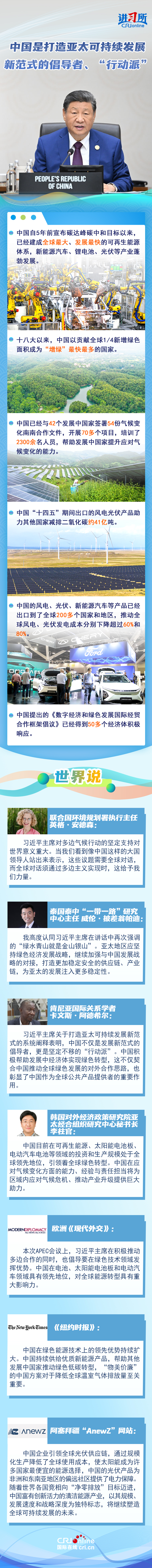 國際社會認為,中國不僅是打造亞太可持續(xù)發(fā)展新范式的倡導者,更是堅定不移的“行動派”,亞太地區(qū)應堅持綠色經(jīng)濟發(fā)展戰(zhàn)略,繼續(xù)加強與中國發(fā)展戰(zhàn)略的對接,打造更加穩(wěn)定安全的供應鏈、產(chǎn)業(yè)鏈,為亞太的發(fā)展注入更多穩(wěn)定性。