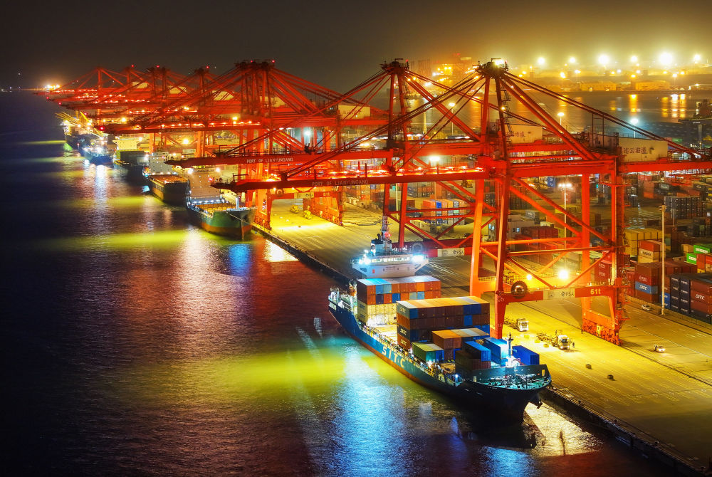 2024年12月14日晚拍攝的江蘇省連云港港集裝箱碼頭(無(wú)人機(jī)照片)。新華社發(fā)(王健民攝)