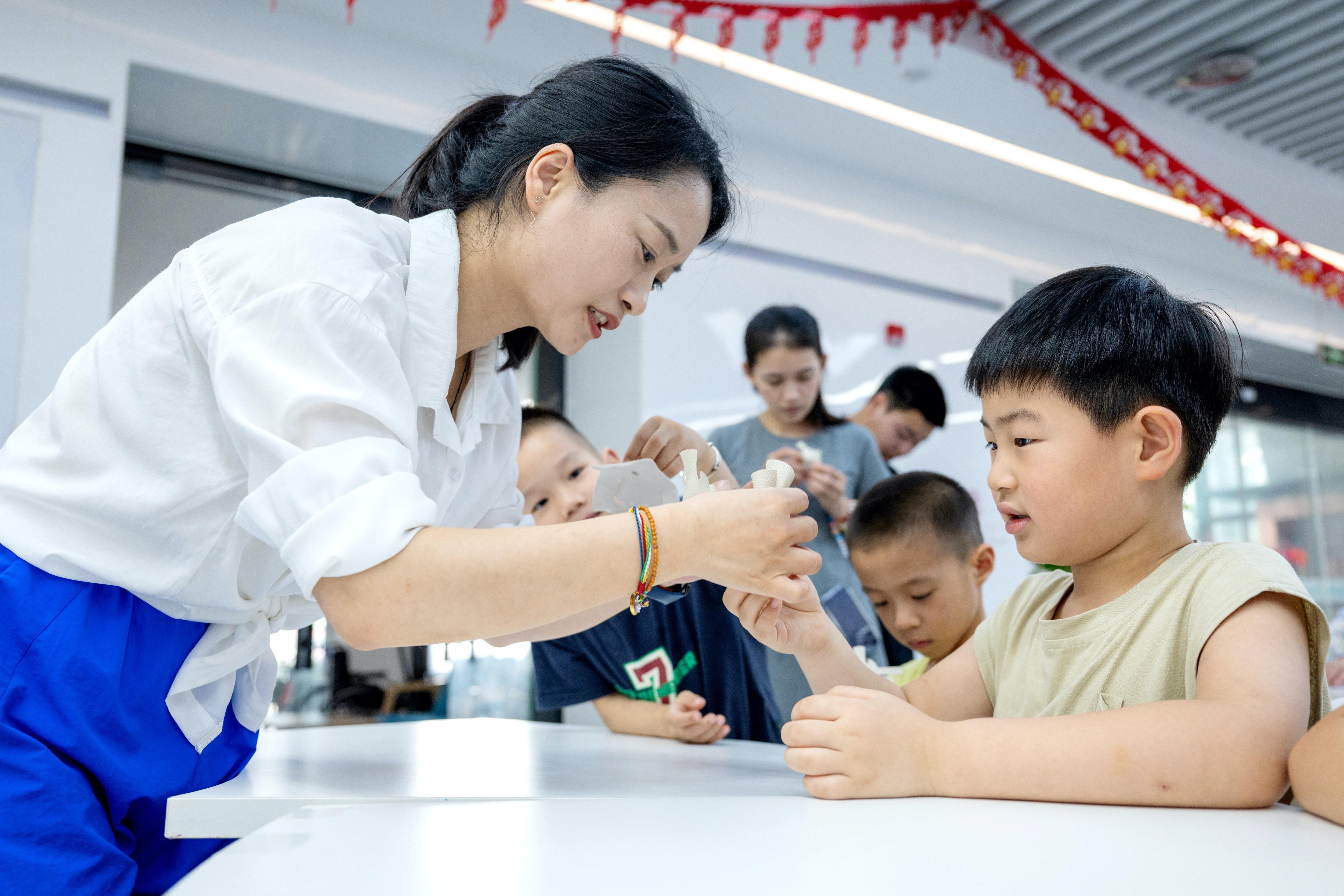 2025年7月3日,浙江湖州長興縣龍山街道齊北社區(qū)幸福鄰里中心,志愿者指導孩子們制作手工。