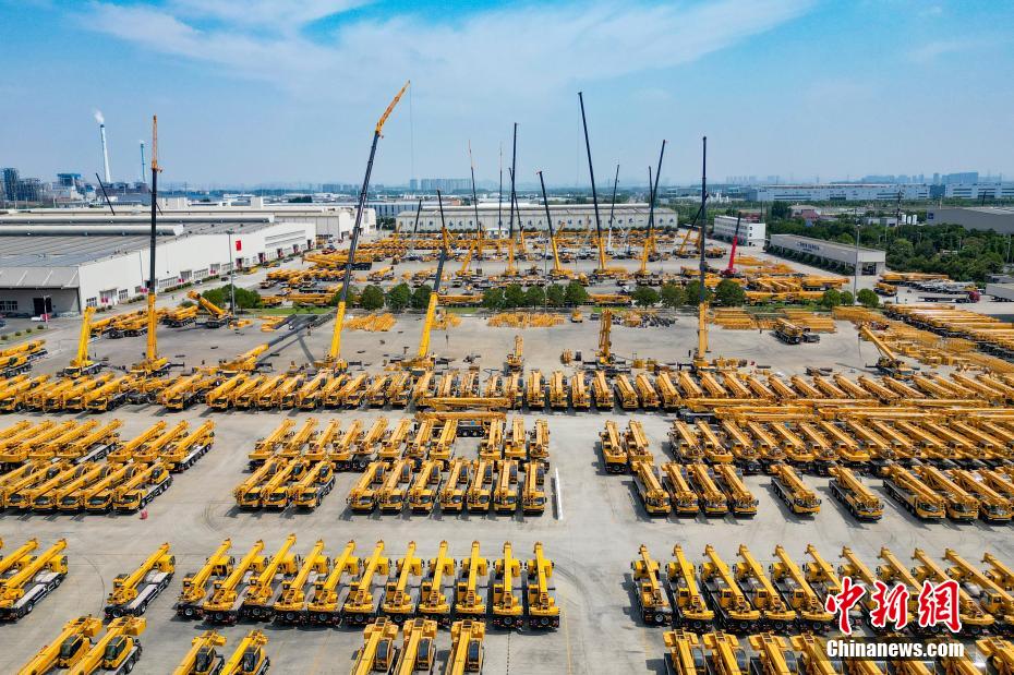 資料圖:徐工集團(tuán)生產(chǎn)車間外停放的起重機(jī)。(無(wú)人機(jī)照片)泱波 攝