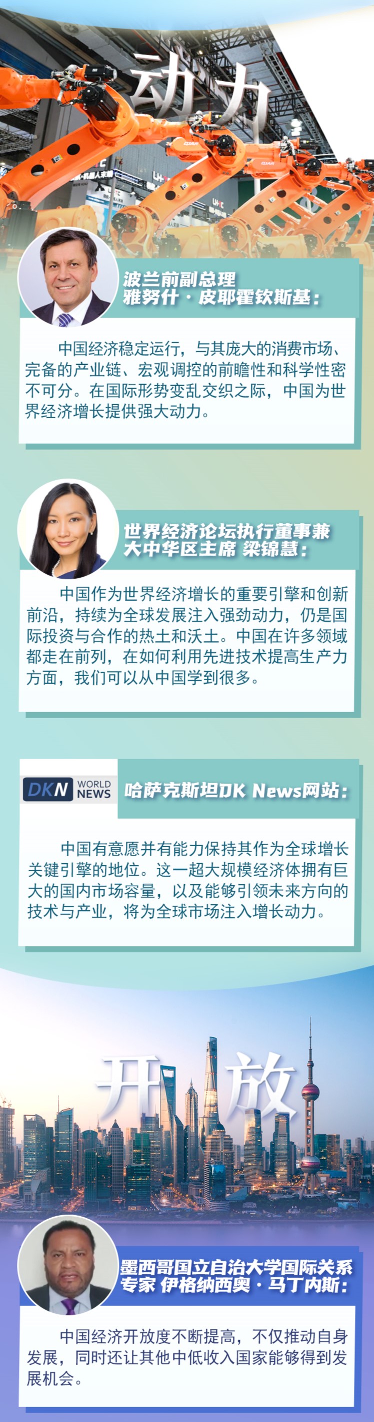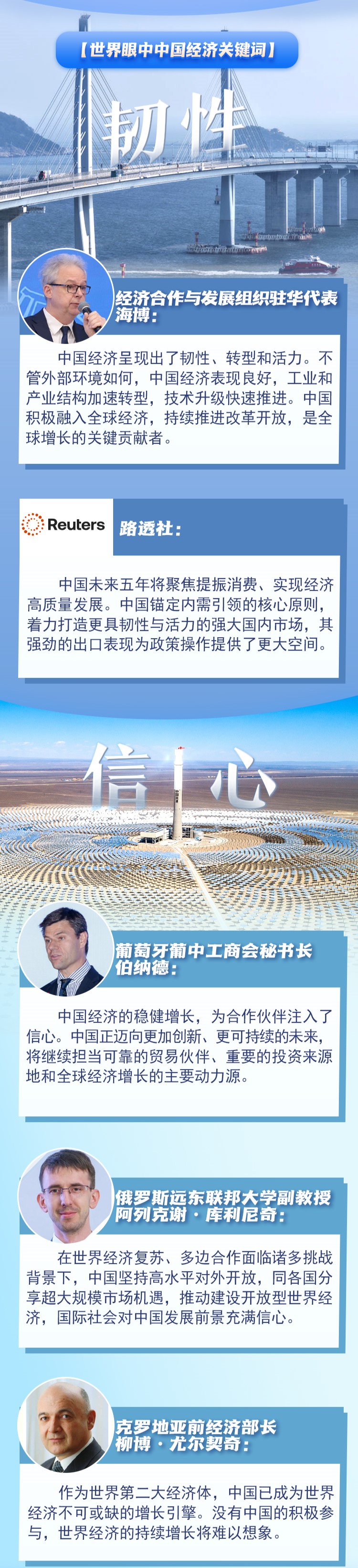 近期,多家國際機(jī)構(gòu)上調(diào)中國經(jīng)濟(jì)增長預(yù)期,多國人士及媒體認(rèn)為,中國是世界經(jīng)濟(jì)增長的重要引擎和創(chuàng)新前沿。韌性、信心、動(dòng)力、開放,成為世界眼中的中國經(jīng)濟(jì)關(guān)鍵詞。