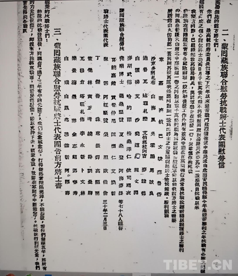 撫今追昔,再讀1941年2月由蒙、回、藏等各民族代表(藏族代表有喜饒嘉措、阿旺堅贊、貢覺仲尼、羅桑堅贊、格桑澤仁、丁杰、倫珠、策覺林、黃正清、劉曼卿、鄧春秀、繞干等)聯(lián)署的《蒙回藏族聯(lián)合慰勞抗戰(zhàn)將士代表團告前方將士書》(以下簡稱《告前方將士書》)(原擬赴各戰(zhàn)區(qū)慰問前線將士,因交通關(guān)系,未能成行),深感它不僅是一封跨越地理阻隔的致敬信,更是一曲蕩氣回腸的民族精神交響曲。當我們將目光聚焦于這份文獻本身,會發(fā)現(xiàn)其中蘊含的精神力量至今仍在激蕩。