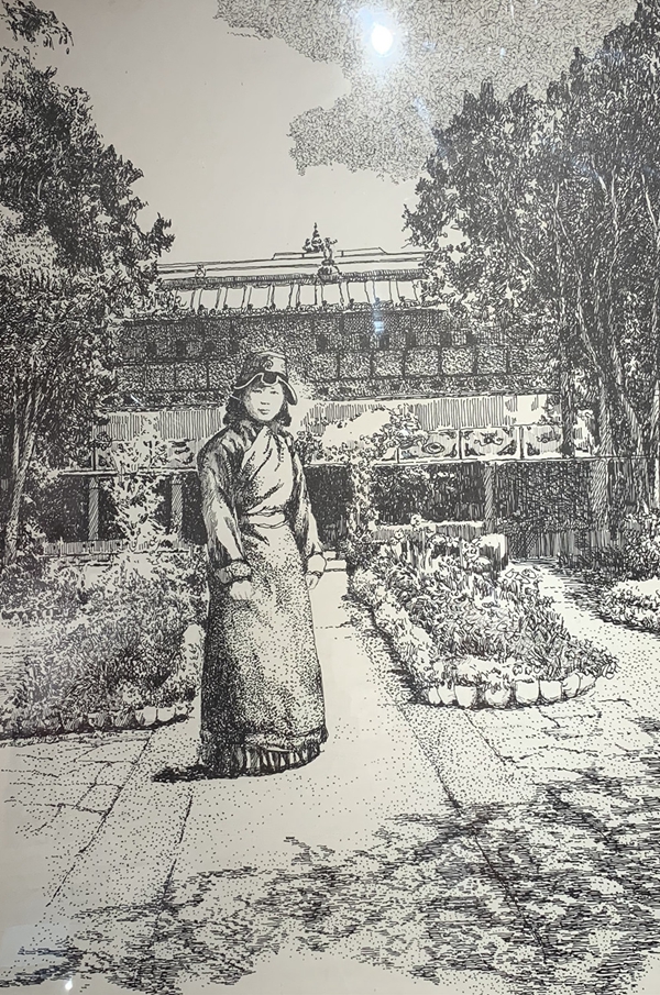 圖為《劉曼卿在拉薩羅布林卡格桑頗章》。翻拍自丁小文鋼筆畫(huà)。