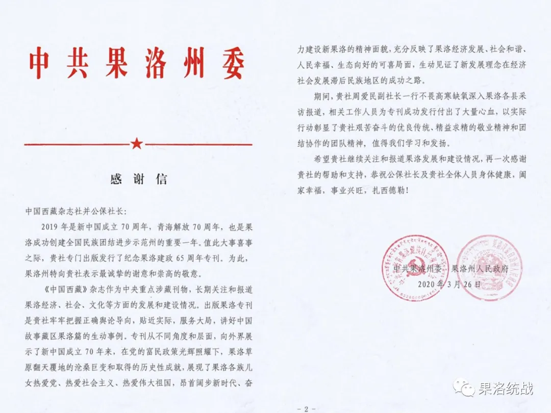 中國西藏網(wǎng)訊 3月26日,中共果洛州委、州人民政府致信中國西藏信息中心,對中國西藏信息中心推出果洛藏族自治州建政65年《中國西藏》雜志??硎靖兄x。