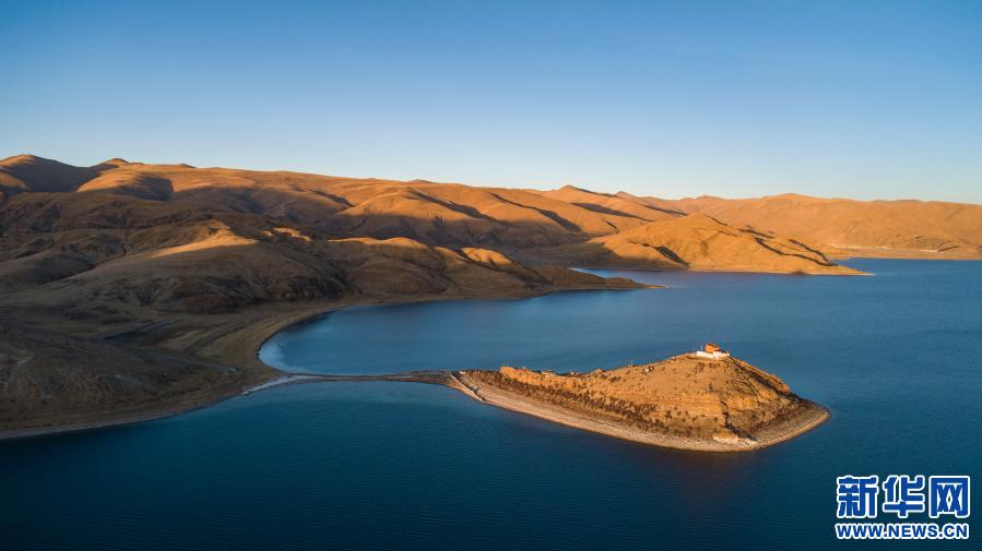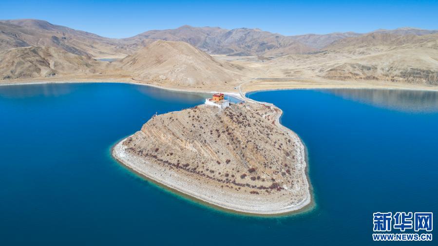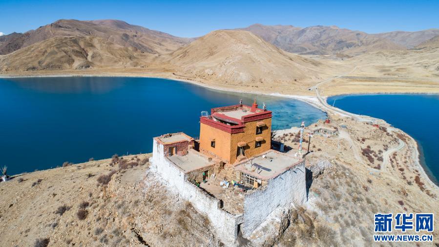 坐落于羊湖北岸一座小島上的日托寺(無(wú)人機(jī)照片,1月10日攝)。新華社記者 孫非 攝