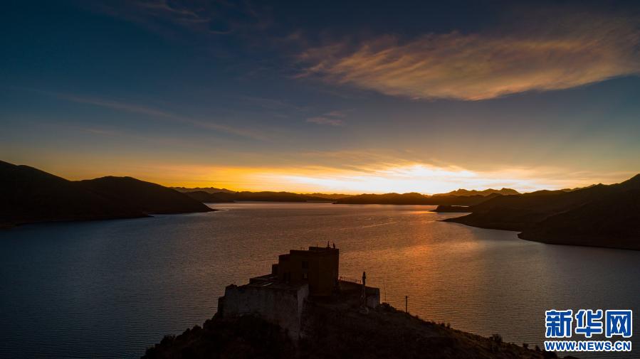 落日余暉下,日托寺的影子倒映在羊湖湖面(無(wú)人機(jī)照片,1月9日攝)。新華社記者 孫非 攝