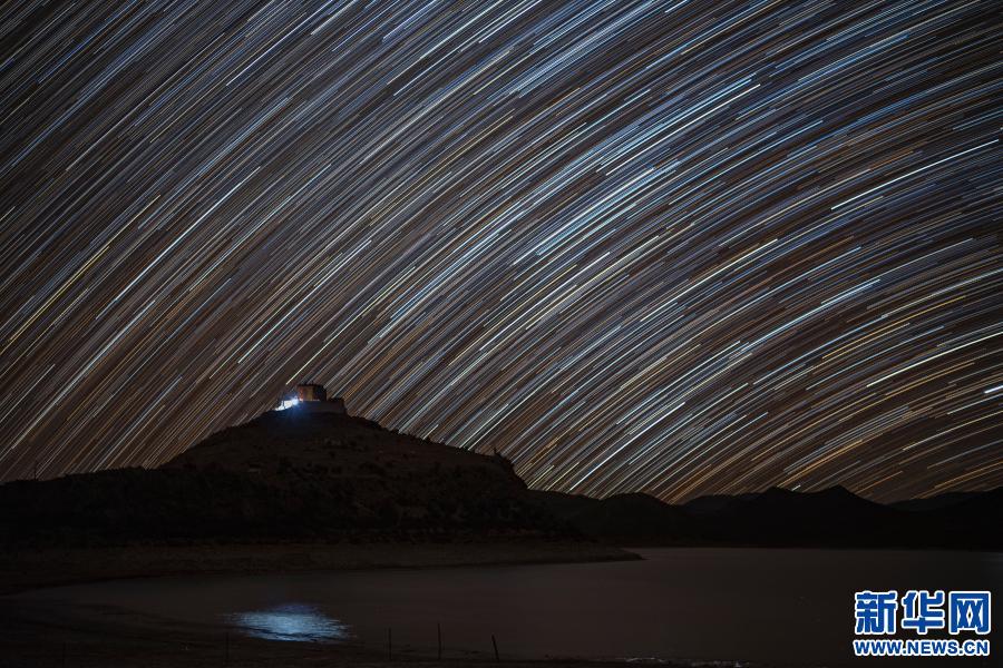 在日托寺附近拍攝的星軌(合成照片,1月10日攝)。新華社記者 孫非 攝