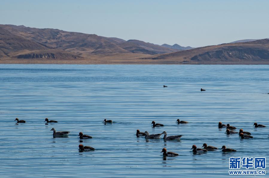這是1月10日拍攝的羊卓雍錯(cuò)湖面上的水鳥(niǎo)。新華社記者 孫非 攝