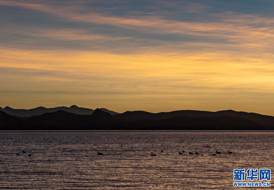 日落時(shí)分,水鳥(niǎo)在羊卓雍錯(cuò)湖面上游曳(1月9日攝)。新華社記者 孫非 攝