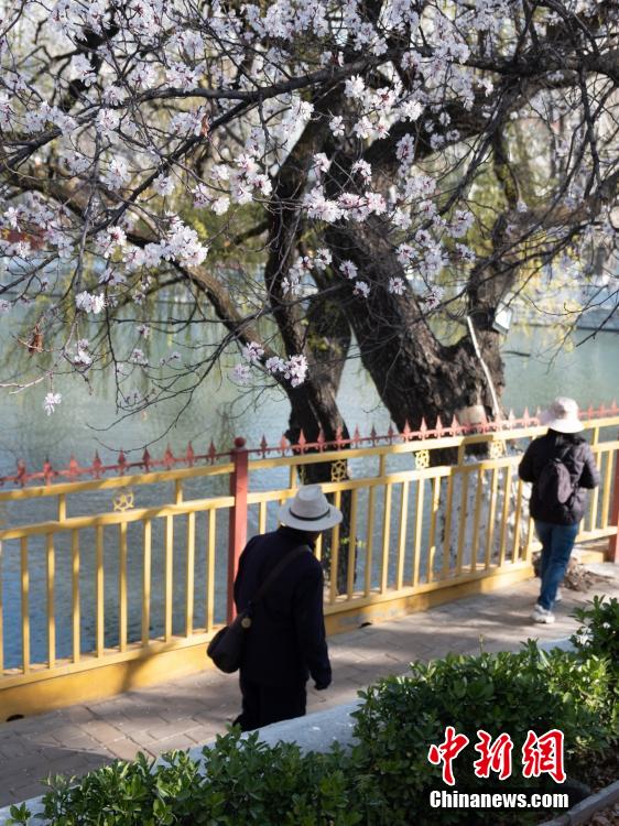 3月23日,拉薩市民、游客路過盛開的杏花樹下。江飛波 攝