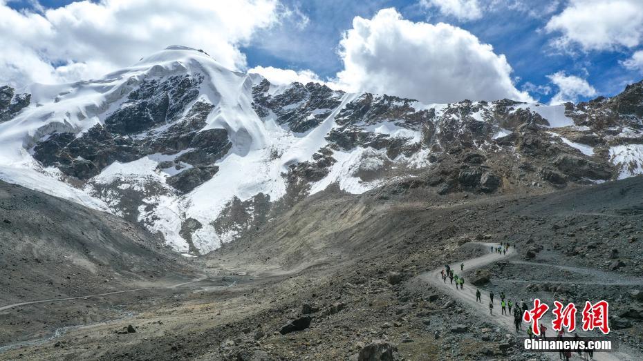 西藏拉薩河谷1號(hào)冰川(廓瓊崗日冰川)景區(qū)將與2021年4月正式全面開(kāi)放,洛堆峰雪山攀登項(xiàng)目也將正式啟動(dòng)。資料圖為游客在洛堆峰游玩。(無(wú)人機(jī)拍攝)中新社發(fā) 貢嘎來(lái)松 攝