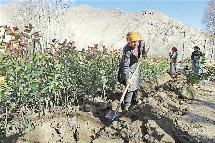 圖為拉薩市曲水縣才納鄉(xiāng)納木村村民正在房前屋后種植樹苗。