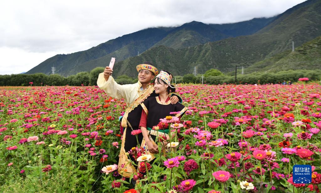 8月30日,游客在林芝市米瑞鄉(xiāng)姆多村花港拍照。新華社記者 晉美多吉 攝