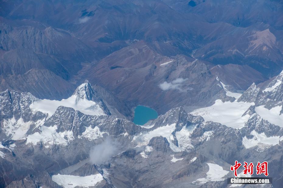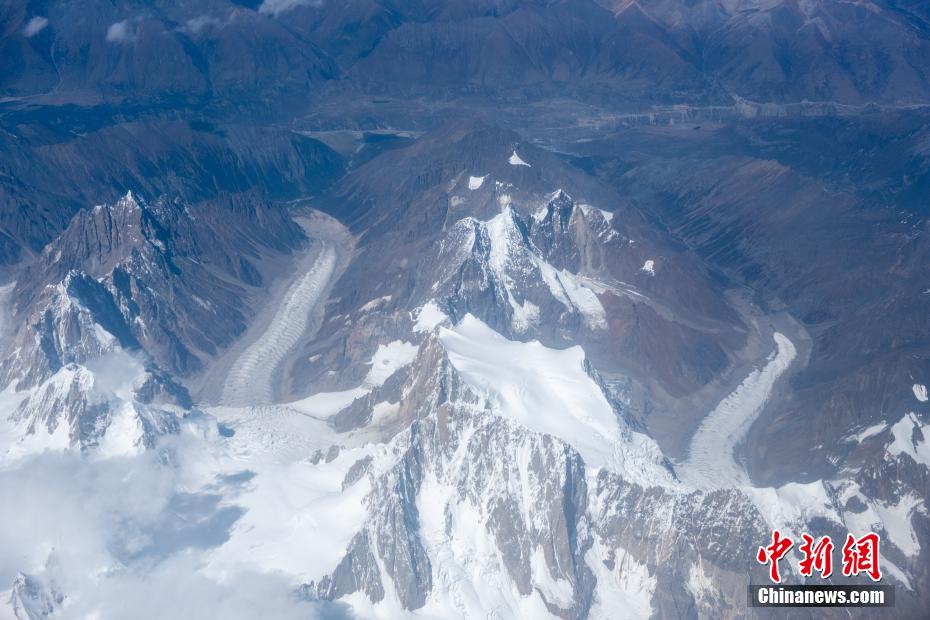 近日,記者從四川成都飛往西藏拉薩的航班上俯瞰青藏高原,一覽高原冰川、湖泊、河流等秀麗風光。圖為10月14日,進藏航班途徑冰川上方,冰川腳下為兩條冰舌。江飛波 攝