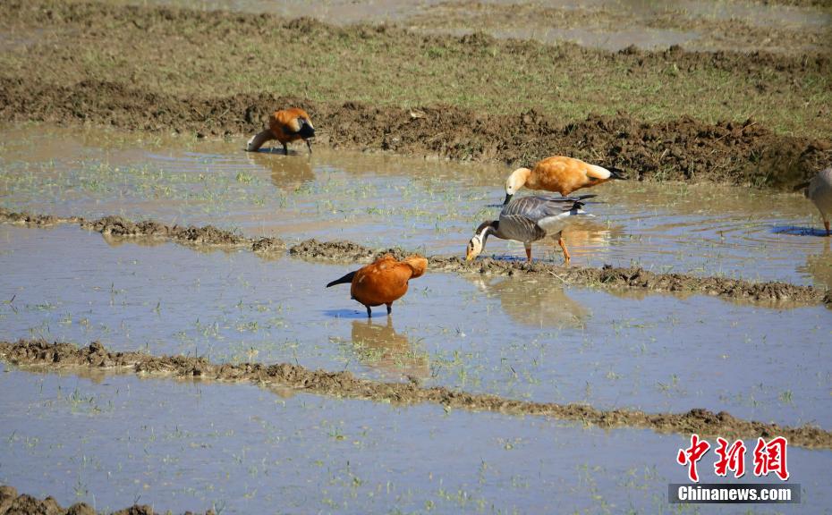 圖為11月12日,斑頭雁、赤麻鴨等鳥類在西藏山南市扎囊縣境內的農田內。冉文娟 攝