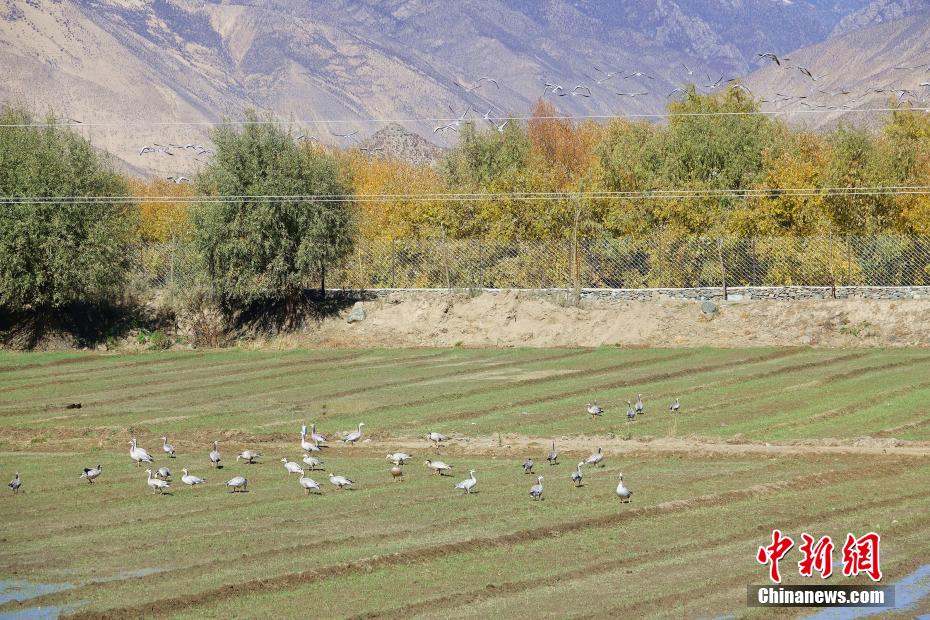 圖為11月12日,斑頭雁、赤麻鴨等鳥類在西藏山南市扎囊縣境內的農田內漫步。冉文娟 攝