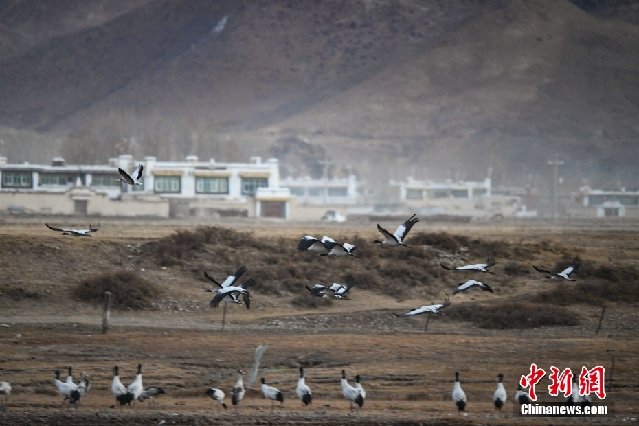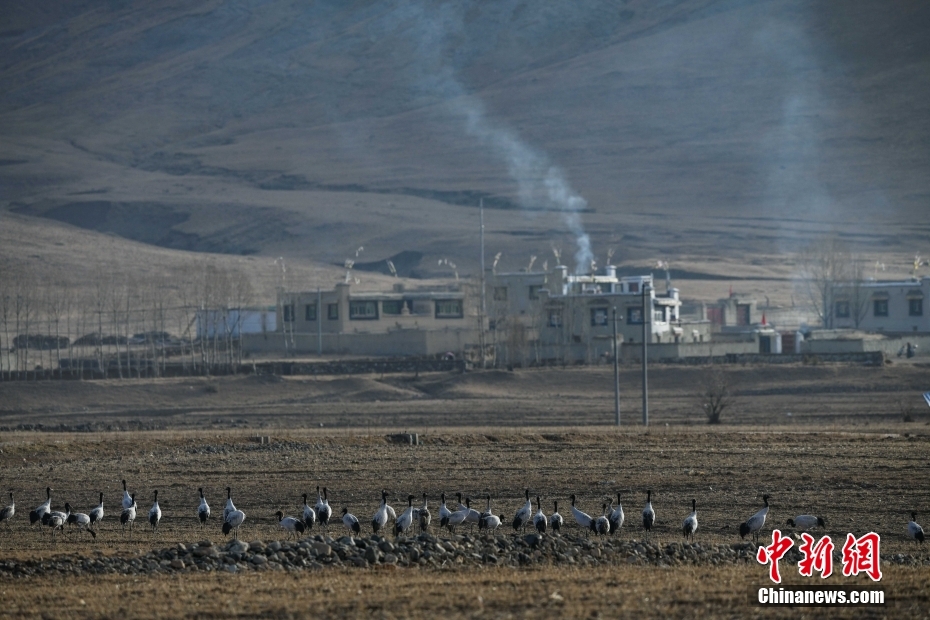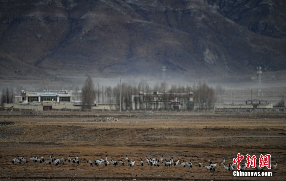 11月23日,西藏自治區(qū)拉薩市林周縣春堆鄉(xiāng),黑頸鶴群正在田野間覓食。由于適宜的環(huán)境和充足的食物,冬季的拉薩市林周縣成了越來越多黑頸鶴聚集的家園。中新社記者 貢嘎來松 攝