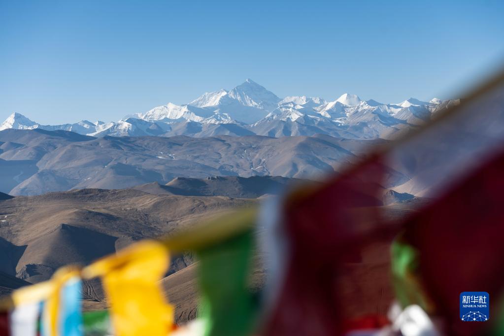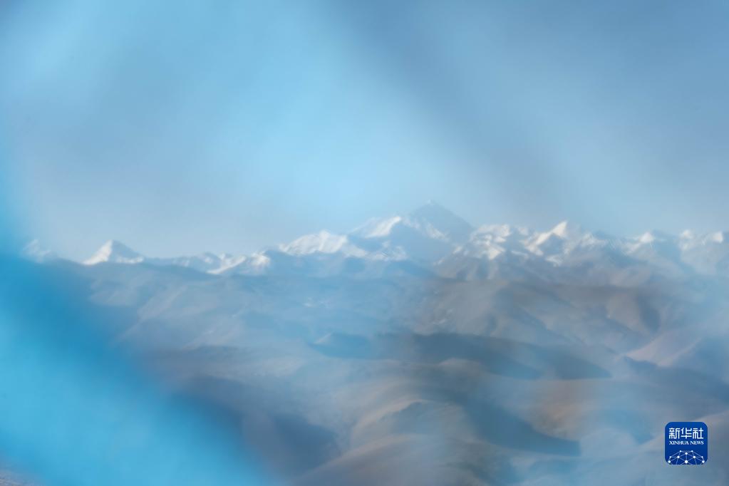 這是3月15日在西藏日喀則透過藍(lán)色經(jīng)幡拍攝的珠穆朗瑪峰。新華社記者 周荻瀟 攝