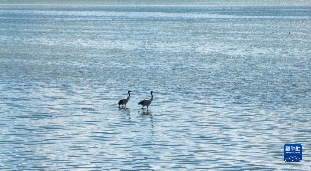 9月16日在多慶湖邊拍攝的黑頸鶴(無人機照片)。新華社記者 晉美多吉 攝