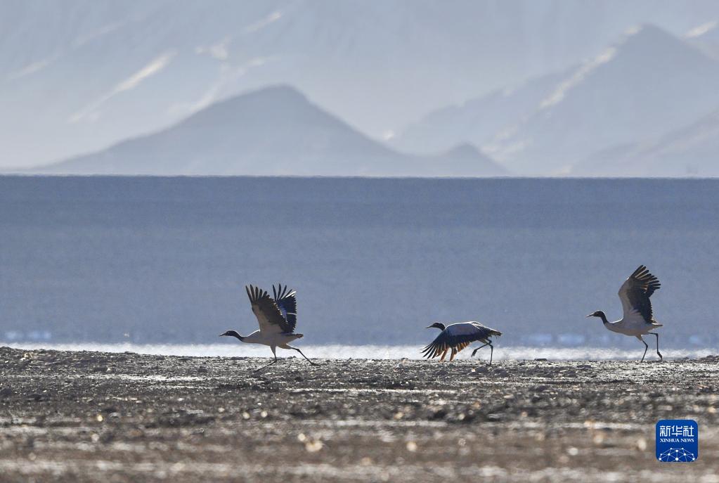 這是在拉薩市林周縣虎頭山水庫拍攝的黑頸鶴(3月1日攝)。新華社記者 張汝鋒 攝