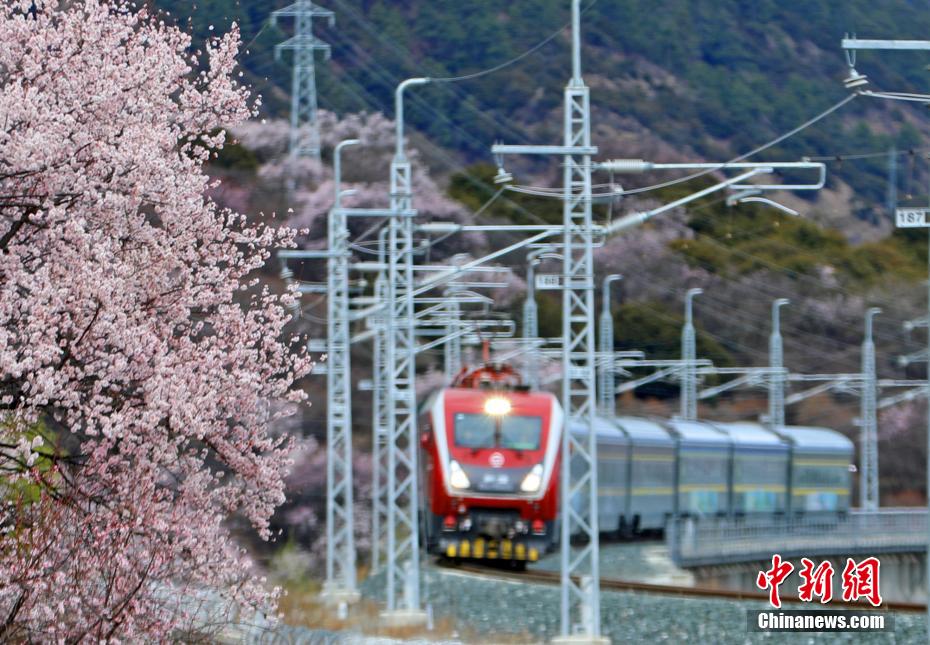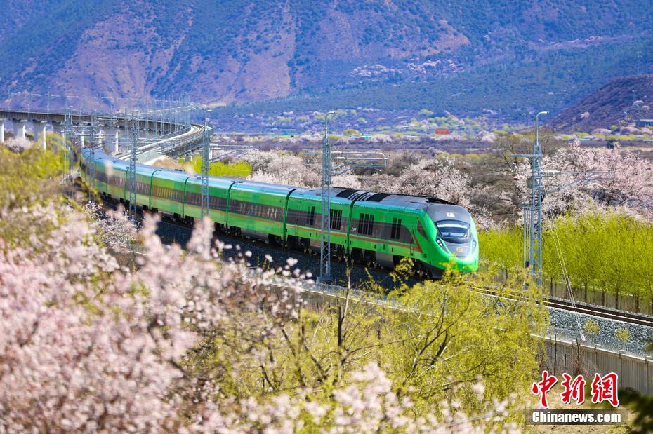 近日,中國(guó)鐵路青藏集團(tuán)有限公司介紹,3月下旬至4月,拉林鐵路沿線綿延的野生桃花林盛開,藍(lán)天、白云、桃花、雪山、高原復(fù)興號(hào)動(dòng)車等相互交織,形成了一幅幅美不勝收的畫面。圖為穿梭在桃花林中的拉林鐵路高原復(fù)興號(hào)。