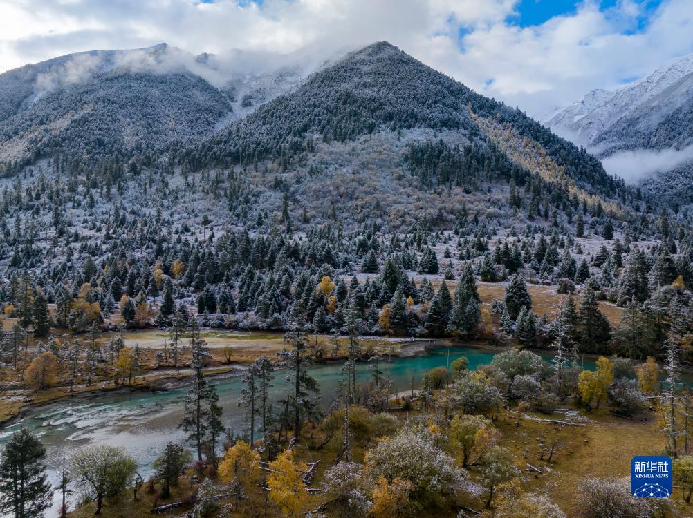 時值金秋,西藏林芝市秋色已濃,黃葉與初雪交織,流水并雪山輝映,景色如詩如畫。