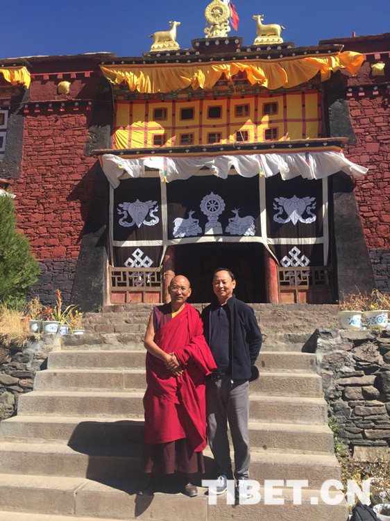 圖為豆格才讓(右一)在藏區(qū)調研時與僧人合影