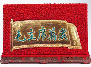 圖為金盾:毛主席萬歲。1951年5月,十世班禪大師敬獻毛澤東主席的禮品。金盾主體部分的五星紅旗是銅質(zhì)鍍金,珍珠鑲嵌旗面周圍,綠松石鑲嵌字體,右側(cè)藏文為“班禪額爾德尼敬獻”。圖片來源:民族文化宮 許娜攝
