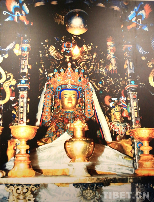 圖為大昭寺釋迦牟尼佛像前裝有3枚靈童名簽的金瓶。
