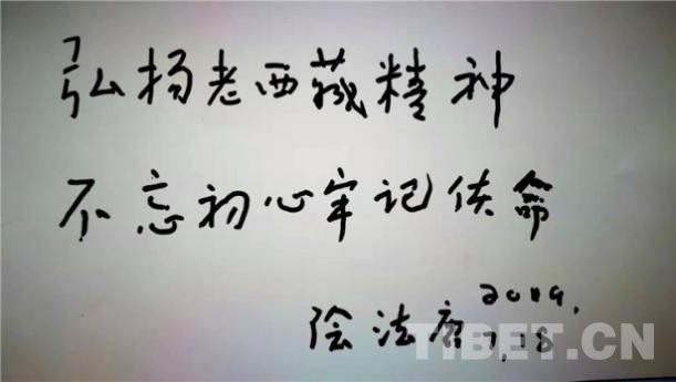 聽(tīng)聞此消息,西藏自治區(qū)黨委原第一書(shū)記陰法唐欣然為該活動(dòng)書(shū)寫“弘揚(yáng)老西藏精神不忘初心 牢記使命”的題詞。