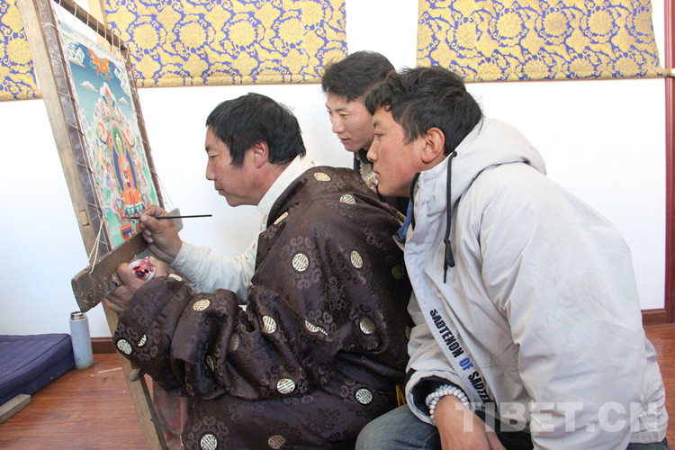 直到今天,父親雖然已經(jīng)離開人世很多年了,曲扎依然堅持子承父業(yè),手握畫筆,在偏遠的山坳里為寺廟、信教群眾繪制唐卡、壁畫。曲扎的3個兒子桑昂然珠(18歲)、土丁格來(14歲)、桑丁特秋(9歲)都在家里跟隨他學(xué)習(xí)勉唐畫派技藝,在祖孫四代的不懈努力下,古老的勉唐畫派在類烏齊縣境內(nèi)得以代代相傳。