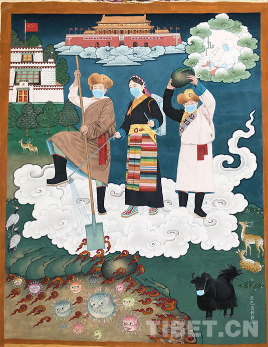 最終,旦巴云丹在畫布上通過5個部分的繪制展現(xiàn)唐卡主題:左上角藏式兩層獨棟小樓、正上方天安門、右上角科學(xué)家日夜奮戰(zhàn)、中間三位藏族民眾驅(qū)趕病毒、右下角野生動物和人類和諧共處。