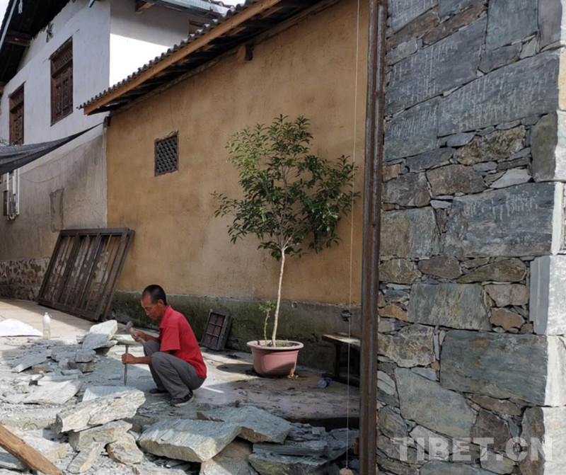 漫步村間,石板鋪就的道路縱橫交錯(cuò),與居民房舍相連。鳥(niǎo)語(yǔ)蟬鳴,人與自然在這里和諧共生。遠(yuǎn)處傳來(lái)石頭的敲擊聲,沿石板路而上,循聲走近,看到一位大爺在家門(mén)口敲擊著大石塊,記者便好奇地上前詢(xún)問(wèn)。這位大爺告訴我們,他在修建自家的大門(mén)。