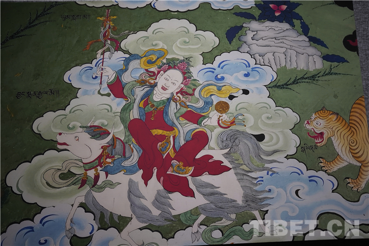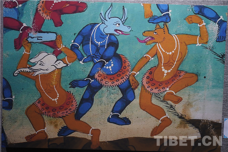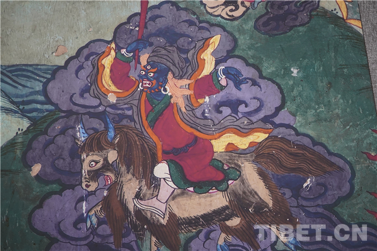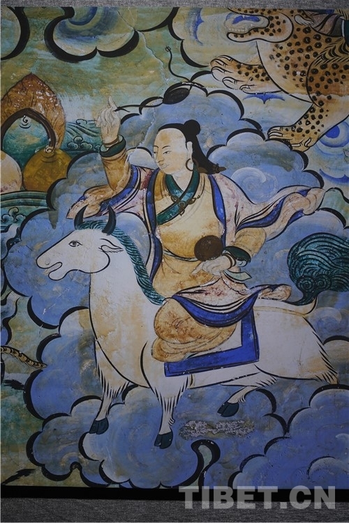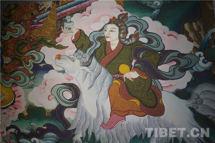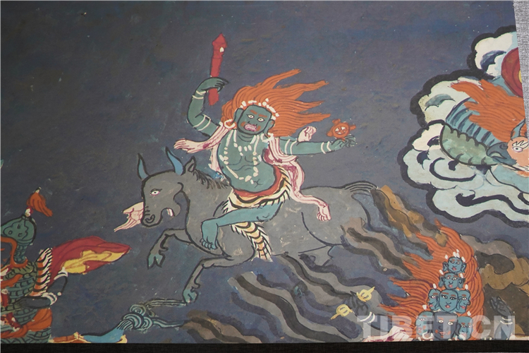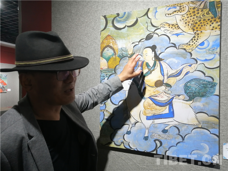 展廳中還有一副遠看非常另類,細細欣賞漢藏繪畫風格交流交融的作品,那是一幅四川省阿壩藏族羌族自治州金川縣墨爾多神山壁畫的局部作品。東智先生說:“這幅局部畫作從發(fā)髻、服飾等多個方面充滿了漢族風格,甚至人物穿的還是漢服,座下是像馬一樣的牦牛,但是手上掄著古朵(古朵指的是用牦牛毛或者山羊毛編織成的拋石繩,可以將石頭投擲到較遠的地方,是牧民們用來放牧的工具),非常有辨識度,充滿藏族文化特色?!?/p>