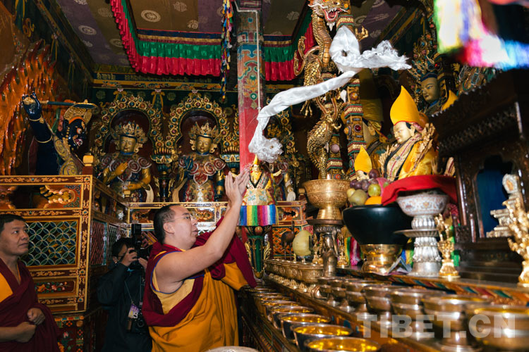9月24日,十一世班禪來到乃堆拉群山中的噶舉寺,在寺院僧人引領下,緩步走入寺院大殿禮佛,為大殿開光加持。隨后十一世班禪前往主殿二樓依次朝拜了甘珠爾殿、噶舉頗章殿、度母殿、強康殿和護法殿。