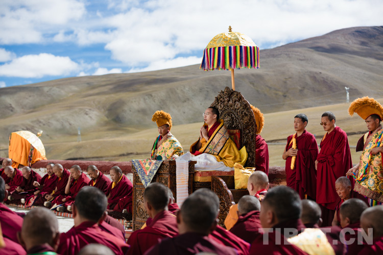 9月27日上午,十一世班禪來到此行海拔最高的真桑寺,受到寺院僧眾的隆重歡迎。僧眾代表向十一世班禪敬獻曼札。十一世班禪為僧眾傳授《六加行》后,到甘珠爾殿朝佛、開光。