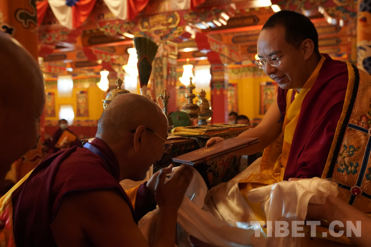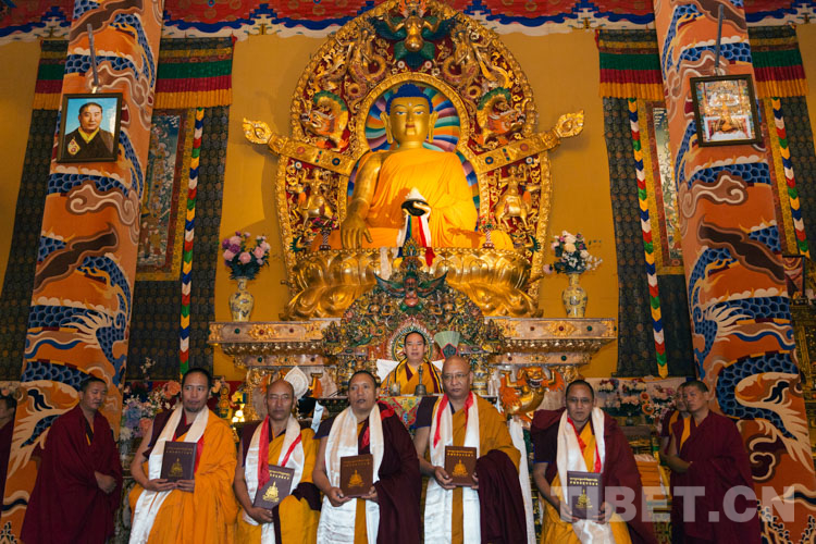 圖為十一世班禪為高僧頒發(fā)然講巴學(xué)位證書 攝影:鄭朔