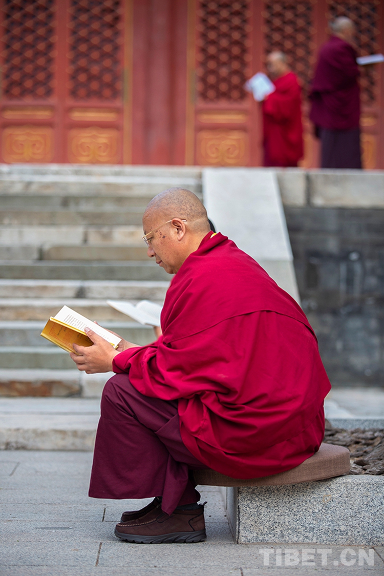 中國西藏網(wǎng)訊 10月29日,深秋的清晨,位于北京西黃寺的中國藏語系高級佛學院內,古柏蒼蒼,清凈肅穆。還有半個小時,2020年藏傳佛教第十六屆“拓然巴”高級學銜畢業(yè)考試辯經(jīng)考試就將準時開始。等待參加辯經(jīng)考試的學僧們,正在西黃寺大殿前誦經(jīng),抓緊時間為考試進行最后的準備。大家或席地而坐,或立定一隅,或踱步前行,梵唱聲聲,余音繞梁。(中國西藏網(wǎng) 攝影/許娜 編輯/周晶)