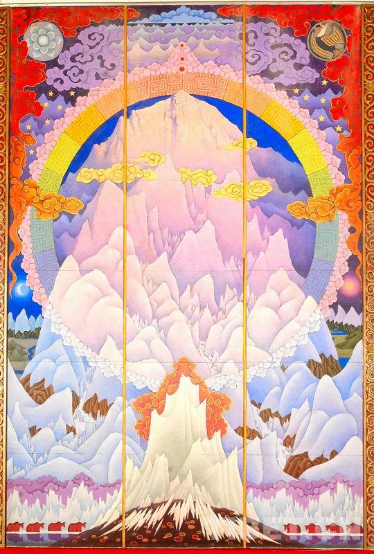 而令葉星生深受觸動(dòng)的,是十世班禪大師對(duì)創(chuàng)作的關(guān)心、前衛(wèi)的創(chuàng)作思路和嚴(yán)格的要求?!笆腊喽U大師多次提出指導(dǎo)意見(jiàn),鼓勵(lì)我們大膽創(chuàng)新,要融入光影等繪畫新技法及漢族傳統(tǒng)繪畫技法,使珠峰更有立體感,使畫作成為現(xiàn)代藝術(shù)技法與藏族傳統(tǒng)繪畫手法相融合的代表,成為民族團(tuán)結(jié)的象征。所以,這幅畫在結(jié)構(gòu)上參考了唐卡,比如彩虹;祥云、太陽(yáng)、月亮、星斗對(duì)稱的方式等來(lái)自西藏傳統(tǒng)壁畫藝術(shù);但在光線、明暗對(duì)比等方面加入了漢地工筆重彩,甚至西方的藝術(shù)手法。在天地之間以更加立體的視角展現(xiàn)出了珠峰壯麗雄偉的全景?!?/p>