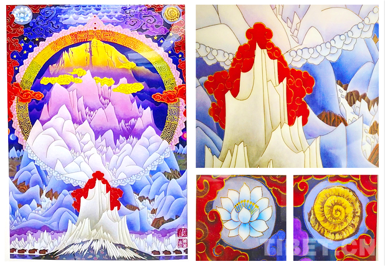 《珠峰疊彩》從1984年開(kāi)始創(chuàng)作,完成于1985年。畫面最高處是聳立在祥云與環(huán)狀彩虹中的珠峰,中景是層層雪山冰川及河流,近景是林立的冰川、雪原、大地、寶石、湖泊和行進(jìn)中的8頭牦牛,畫面右上角是珠峰雪蓮,左上角是珠峰化石,寓意吉祥幸福。
