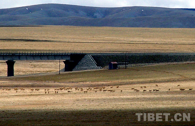 藏北高原,在藏語里稱為“羌塘”。這里棲息著的藏羚羊,每年春夏季都會大規(guī)模由南向北長距離遷徙,五道梁至楚瑪爾河一帶是必經(jīng)之路。為了保證藏羚羊自由遷徙,青藏鐵路在這里設(shè)立了四處野生動物通道。其中長11.7公里的清水河特大橋和長4公里的楚瑪爾特大橋,采取“以橋代路”形式設(shè)計動物通道,供野生動物通過。
