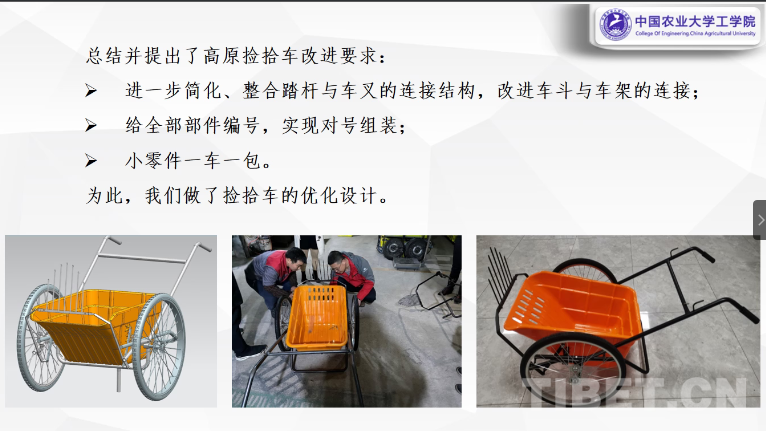 啟動(dòng)會(huì)上,高原撿拾車研發(fā)首席專家中國農(nóng)業(yè)大學(xué)工學(xué)院教授王光輝介紹了高原撿拾車最新改版的情況。他表示,針對過去推廣中發(fā)現(xiàn)的個(gè)別問題,對車子進(jìn)行了優(yōu)化設(shè)計(jì),去掉了易發(fā)生損壞的控叉線閘,調(diào)整了車身的踏桿與車叉的連接結(jié)構(gòu),改進(jìn)車斗與車架的連接,做到了對號(hào)組裝和小零件一車一包等,使安裝更加便捷、使用更加方便、車子更加堅(jiān)固。