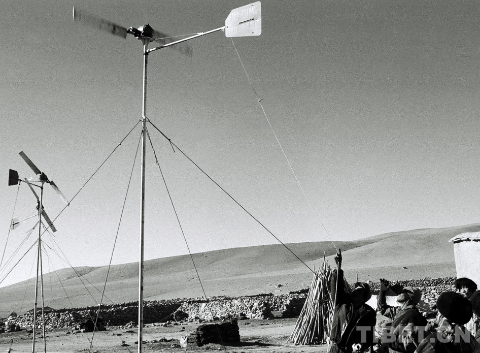 圖為那曲風(fēng)能實驗站技術(shù)人員為雙湖辦事處(現(xiàn)改為雙湖縣)嘎措鄉(xiāng)牧民檢修保養(yǎng)所安裝的風(fēng)力發(fā)電機 唐召明1988年攝
