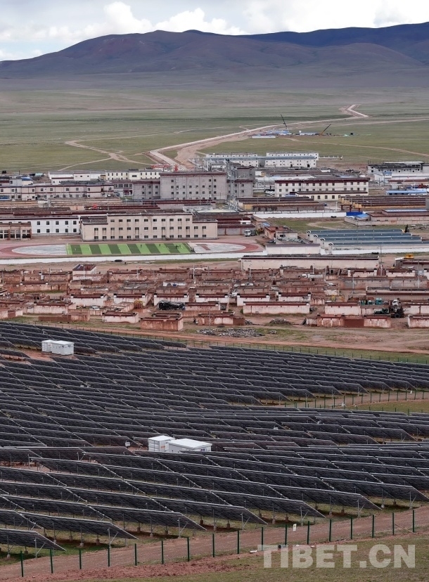 圖為藏北雙湖縣新建成的太陽能光伏電站。照片前景所豎立的成片黑色板是用來發(fā)電的硅光電池板 唐召明2017年7月25日攝